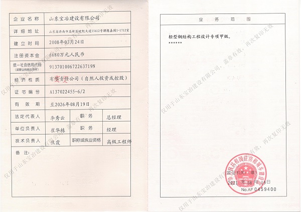 山東寶冶建設有限公司地處山東省濟南市高新技術開發區。經過多年的發展,現已具備建筑施工總承包、電力工程施工總承包、承裝(修、試)電力設施專業承包、鋼結構工程專業承包、特種工程(結構補強)專業承包、建筑裝修裝飾工程專業承包、建筑機電安裝工程專業承包、建筑幕墻工程專業承包、消防設施工程專業承包、防水防腐保溫工程專業承包、輕型鋼結構工程設計專項資質,可承接上述資質承攬范圍內的工程設計與施工。